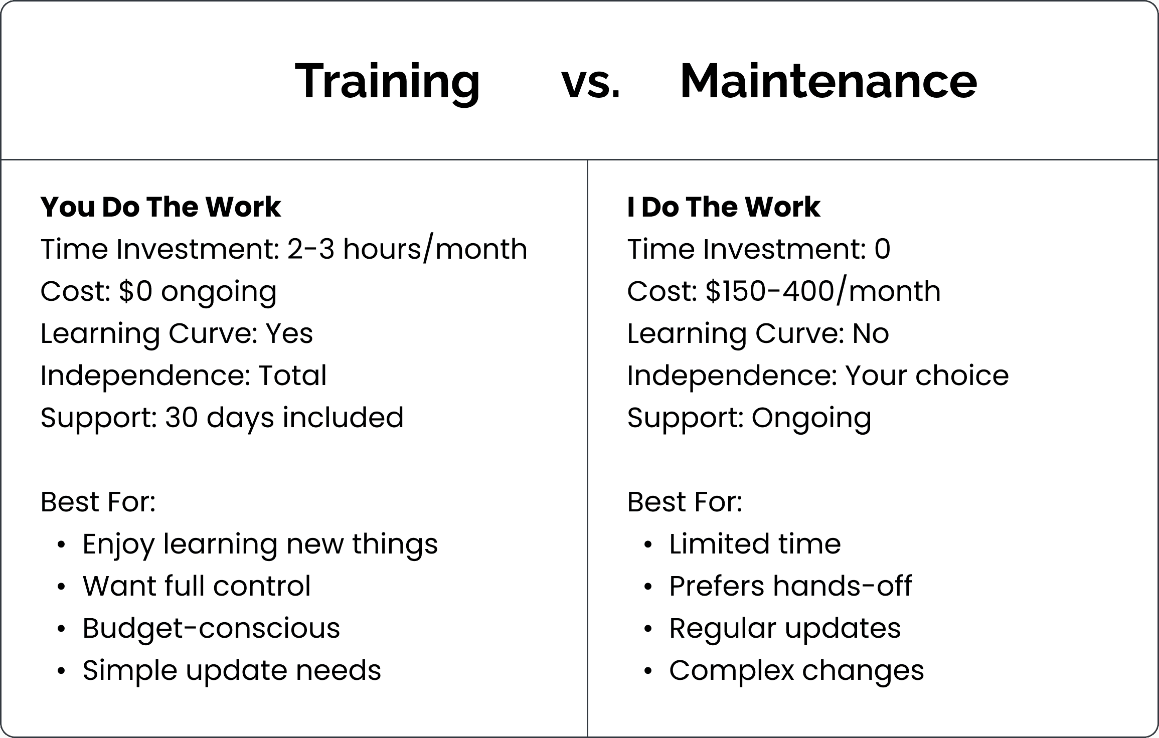 You can have it your way: comprehensive training so you can feel confident running your digital content or ongoing maintenance so you can focus on your business and I'll handle the updates.
